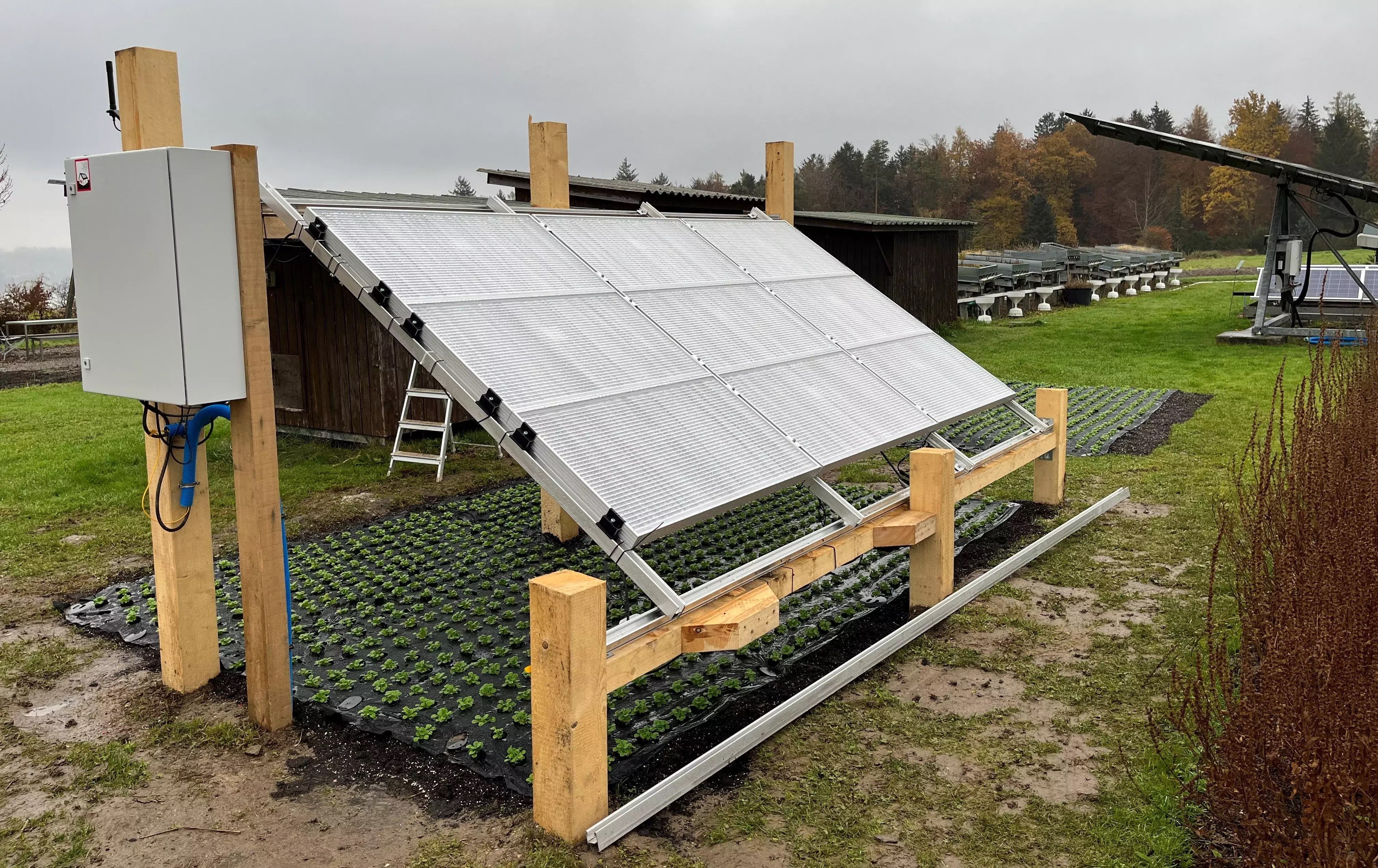 In einem Agrovoltaic-Vorversuch in Wädenswil wurde das Pflanzenwachstum von nüsslisalat (Valerianella locusta L.) in drei Wachstumsperioden (Winter, Vorfrühling und Spätfrühling) unter Solarmodulen untersucht. Die Solarmodule waren in einer Höhe von 0,60 bis 1,60 m über dem Boden in einer 3 x 3 Anordnung angebracht. Resultate: Chlorophyllgehalt, Blattlänge und -breite sowie die spezifische Blattfläche (SLA) waren unter den Solarmodulen signifikant höher (p < 0,05). Über alle Anbauperioden hinweg war das Frischgewicht unter und hinter den Modulen um 17 % höher bzw. 8 % niedriger als bei der Kontrolle. Der Einfluss der Behandlungen variierte stark mit der Jahreszeit. Kopfsalat unter den Solarmodulen wies im Winter und im späten Frühjahr das höchste Frischgewicht auf. Im zeitigen Frühjahr war das Frischgewicht unter den Modulen und in der Kontrolle identisch.